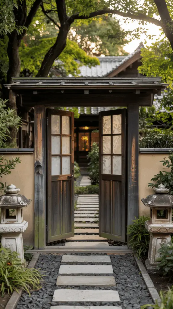 Imagine two staggered wood or stone screen panels—maybe one solid, one slatted—placed just off the path that leads to your main entrance. They don’t fully block the view, but they shape it. The gate itself might be hidden between them, or the panels are the gate—just with a subtle opening between them.