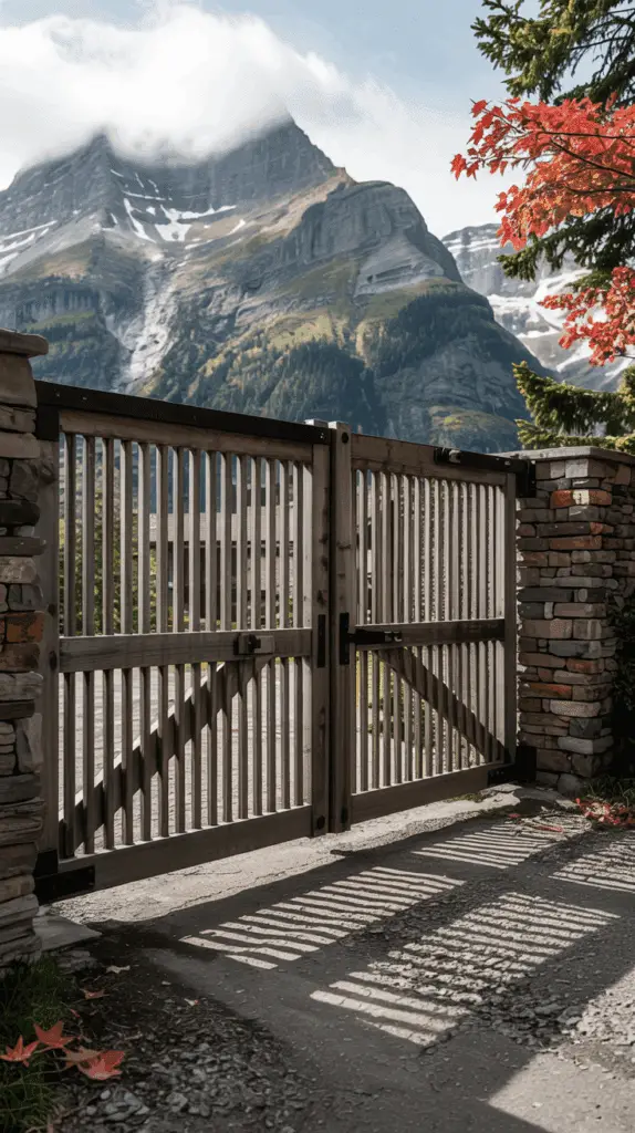 Modern homes love a sliding gate—and for good reason. They’re practical on tight mountain lots and they don’t swing out awkwardly into gravel paths. This design takes a modern sliding mechanism and pairs it with wooden slats in varied widths, casting striped shadows across the ground at different times of day.