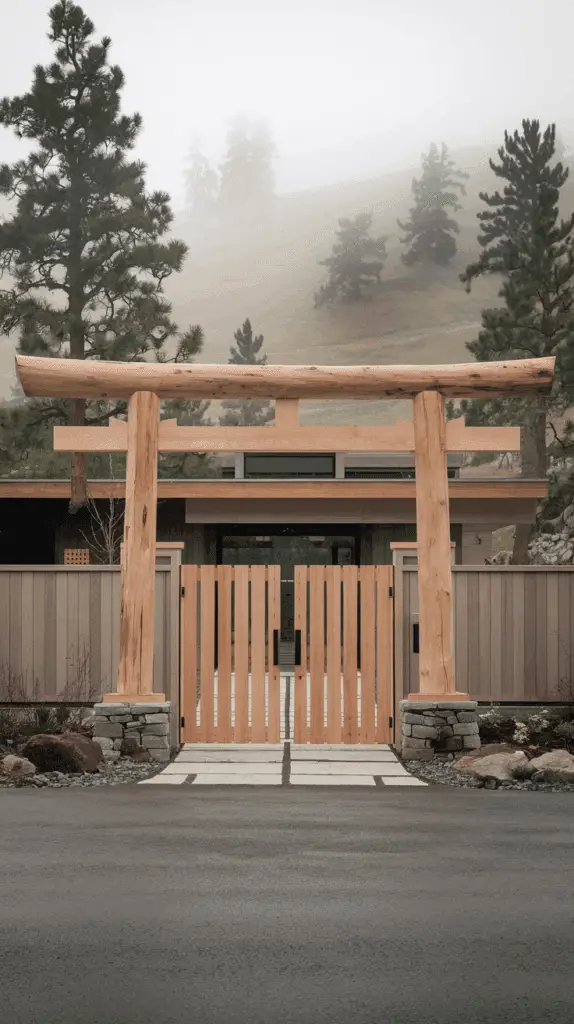 Ok, this isn’t quite Chinese, but theres a lot of similarities between the Torii gate and Chinese gate design. If your modern mountain home leans towards Scandi-zen, this is the one to look at first. Inspired by the clean lines of a traditional Torii gate, this design uses two vertical posts and a simple horizontal beam—no curved flourishes, no ornate carvings. Just calm, balanced proportions in natural wood.