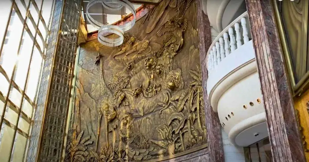 Inside, the hotel continues to impress. One of the first things that caught my eye was a massive sculpture spanning an entire wall—a mesmerizing mix of abstract art and nature, featuring intricately carved animals emerging from the surface.