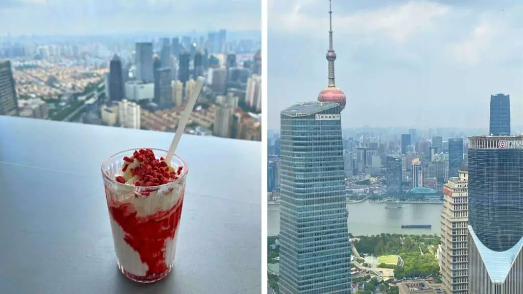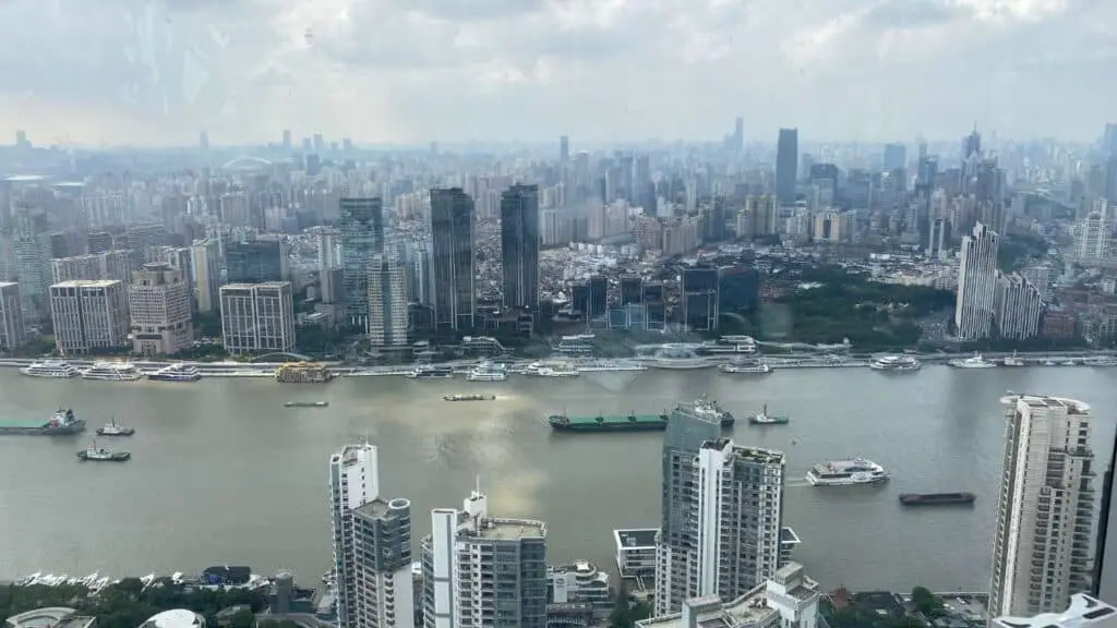 But the real star of the visit is the balcony café. It’s not just a place to grab a drink—this is where the view really takes over. Through floor-to-ceiling windows, you can see across the whole of Pudong and over to the Bund on the other side of the Huangpu River. On a clear day, you can even see the curve of the river winding through the city.