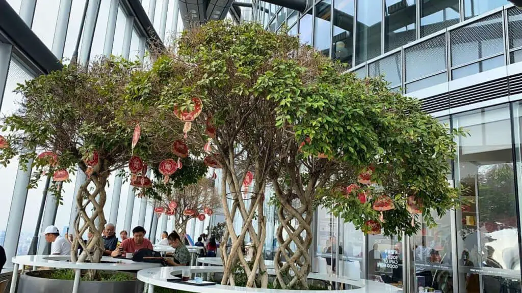 The outer balcony area is beautifully designed, with wooden decks, small trees, potted plants, and benches where people sit quietly with a book or coffee. There’s even a small bell that sometimes rings softly in the wind. It doesn’t feel like you’re in a major city at all—it feels like a peaceful hideaway above the clouds.